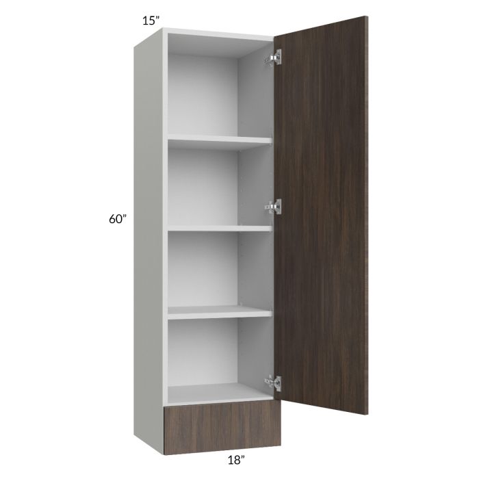 Wall cabinet with (1) 6-3/4" drawer on bottom (drawer front height) and (1) 53" high door on top. There will be 3 adjustable shelves on the top of the cabinet. The exposed sides have near-flush ends and are unfinished, wainscot panels can be ordered to finish exposed sides. **Note this cabinet has a 15" depth**