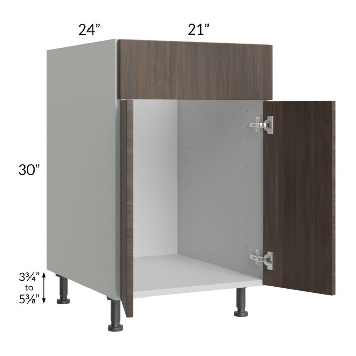 Sink base cabinet with 1 door and (1) 6-3/4" false drawer front. This cabinet will have no shelves (the sides will come pre-drilled with shelf clip holes if loose shelves are needed - which need to be purchased separately). Black, adjustable, plastic furniture feet will also be included which will add 3-3/4" to 5-3/8" to the 30" height.