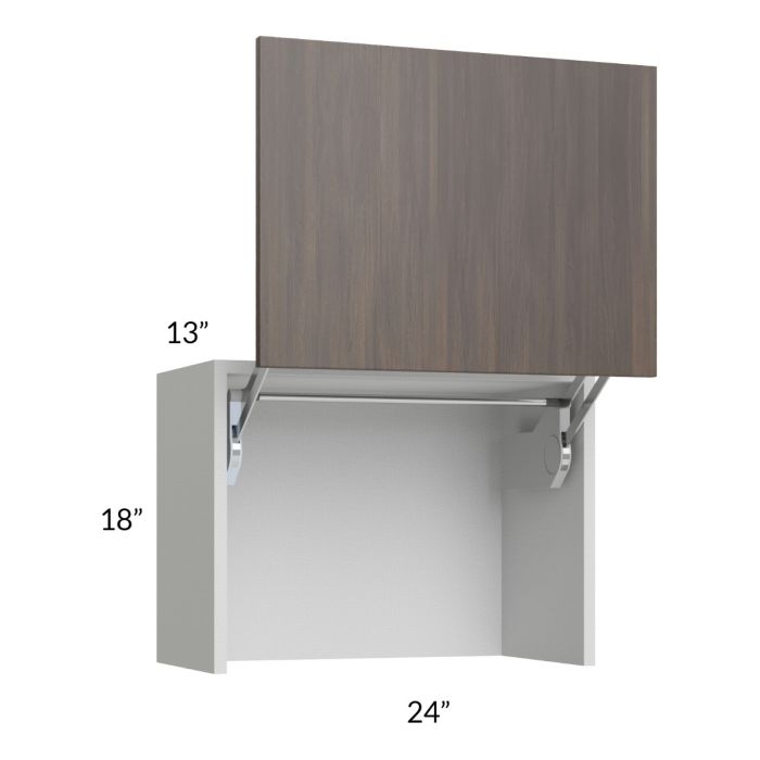 Wall appliance cabinet that is meant to sit on the countertop to hide appliances, it will have an open floor and no bottom rail. It features Blum Lift-Up & Away Hinges to allow the door to lift up and away from the face frame of the cabinet. It will be shipped with a support bracket to be removed before cabinet installation.