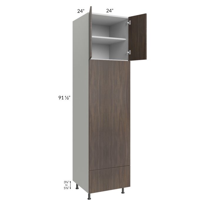 Double oven cabinet with two 23-7/8" high doors on top with one shelf, and one 11-7/16" high drawer on bottom (height is drawer front height). The oven cabinet has a full panel that will need to be cut on site, the maximum cutout is 22"W x 55"H. When using two appliances, it is recommended to provide support for the top appliance; PLY-3/4 can be used and would need to be purchased separately, and then installed on site. Black, adjustable, plastic furniture feet will also be included which will add 3-3/4" to 5-3/8" to the 91-1/2" height.