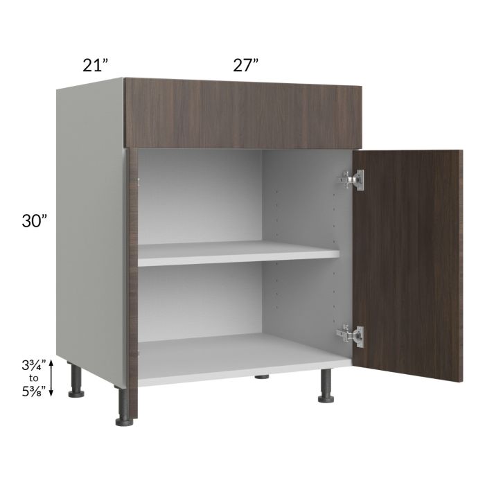 Vanity base cabinet with (2) doors, (1) drawer, and (1) 18" deep shelf. The drawer front is 6-3/4" high. Black, adjustable, plastic furniture feet will also be included which will add 3-3/4" to 5-3/8" to the 30" height.