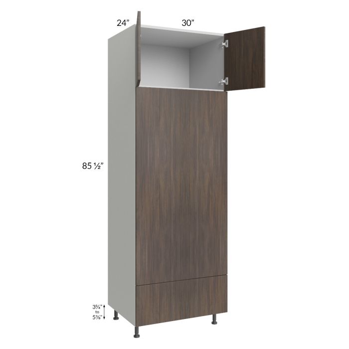 Double oven cabinet with two 17-7/8" high doors on top and one 11-7/16" high drawer on bottom (height is drawer front height). The oven cabinet has a full panel that will need to be cut on site, the maximum cutout is 28"W x 55"H. When using two appliances, it is recommended to provide support for the top appliance; PLY-3/4 can be used and would need to be purchased separately, and then installed on site. Black, adjustable, plastic furniture feet will also be included which will add 3-3/4" to 5-3/8" to the 85-1/2" height.
