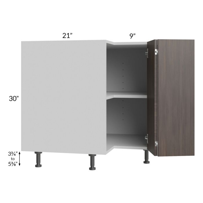 Easy reach corner cabinet that will take up 33" from the corner out, on each wall. It comes with one adjustable shelf and will not have soft close hinges. The cabinet will have a 21" depth for an easier installation, however due to the smaller depth, it must be pulled out 3" off both walls (thus, taking up 24" of wall space on each wall). This gap will not be visible once countertops are installed. Once assembled, the door cannot be reversed, so be sure to specify left or right hinging (as if facing the cabinet). Black, adjustable, plastic furniture feet will also be included which will add 3-3/4" to 5-3/8" to the 30" height.