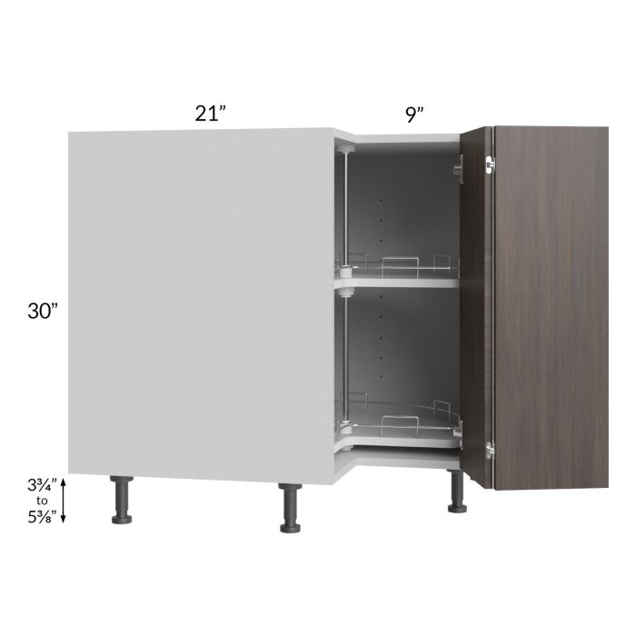 Lazy susan base cabinet that will take up 33" from the corner out, on each wall. Both wooden Lazy Susan trays rotate independently and the center tray is mounted on a 3/4" adjustable shelf. This cabinet cannot use a soft close hinge. Each bi-fold door is 9" wide. It is designed to have a smaller footprint for ease of installation (which is why the depth is 21"). Black, adjustable, plastic furniture feet will also be included which will add 3-3/4" to 5-3/8" to the 30" height.