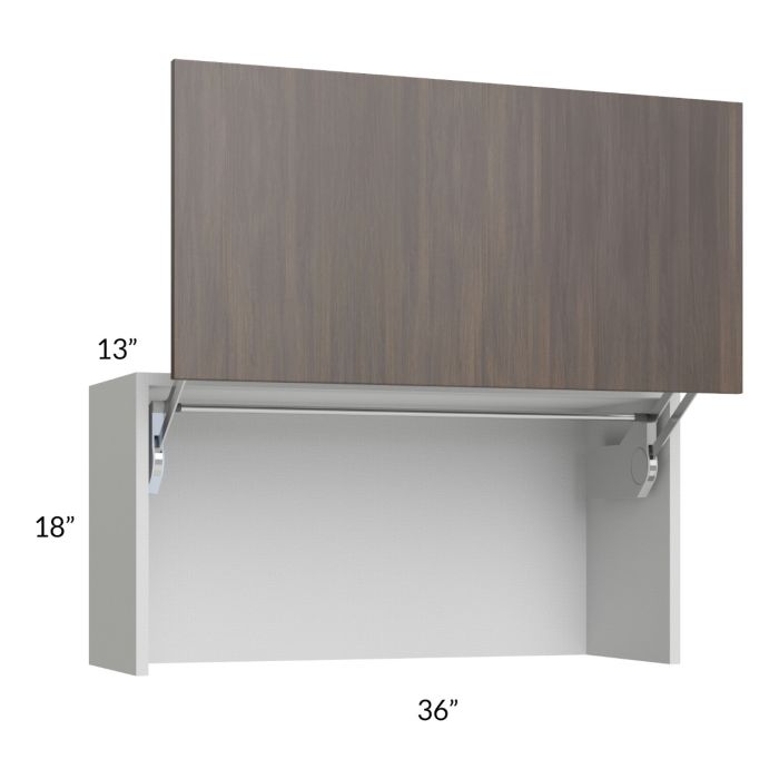 Wall appliance cabinet that is meant to sit on the countertop to hide appliances, it will have an open floor and no bottom rail. It features Blum Lift-Up & Away Hinges to allow the door to lift up and away from the face frame of the cabinet. It will be shipped with a support bracket to be removed before cabinet installation.