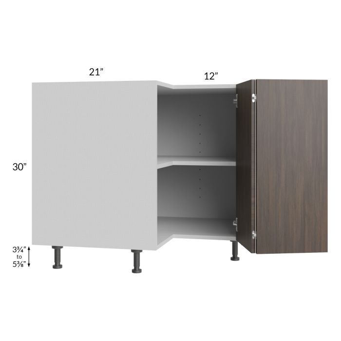 Easy reach corner cabinet that will take up 33" from the corner out, on each wall. It comes with one adjustable shelf and will not have soft close hinges. The cabinet will have a 21" depth for an easier installation, however due to the smaller depth, it must be pulled out 3" off both walls (thus, taking up 24" of wall space on each wall). This gap will not be visible once countertops are installed. Once assembled, the door cannot be reversed, so be sure to specify left or right hinging (as if facing the cabinet). Black, adjustable, plastic furniture feet will also be included which will add 3-3/4" to 5-3/8" to the 30" height.