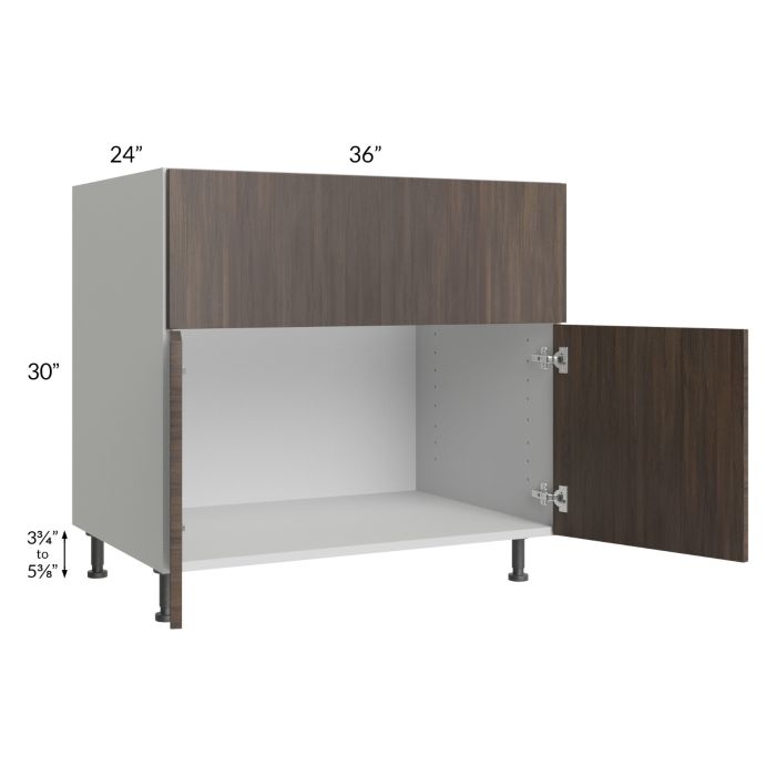 Farm sink base cabinet. Door heights are 17-7/8" and the height above the doors to the top of the cabinet is 11-7/8". Typically, the farm sink base should be a minimum of 3" wider than the farm sink (for example, a 30" farm sink would need a 33" farm sink base).The front panel is attached with clips for easy removal and install. Once removed, the opening will need to be cut, the maximumum it can be cut is 34-1/2"W x 11-5/8"H, then the panel will be reattached back onto the cabinet. To avoid damage to the frame and side panels, please apply extra care when cutting the front panel, blue masking tape is the most commonly used to avoid splintering (strong adhesives must be avoided to avoid pulling the finish off). Black, adjustable, plastic furniture feet will also be included which will add 3-3/4" to 5-3/8" to the 30" height.
