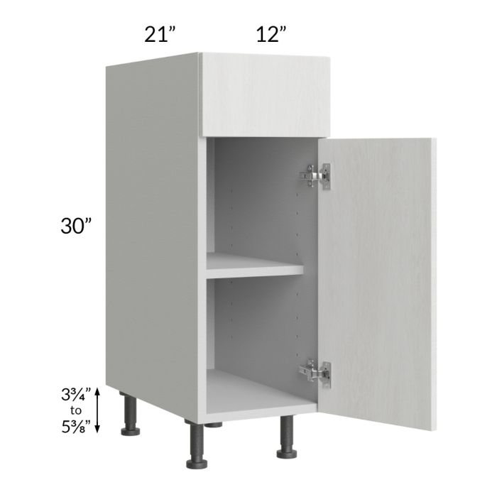 Vanity base cabinet with (1) door, (1) drawer, and (1) 18" deep shelf. The drawer front is 6-3/4" high. Black, adjustable, plastic furniture feet will also be included which will add 3-3/4" to 5-3/8" to the 30" height.