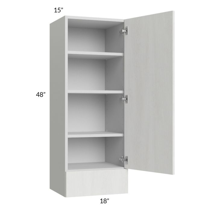 Wall cabinet with (1) 6-3/4" drawer on bottom (drawer front height) and (1) 41" high door on top. There will be 3 adjustable shelves on the top of the cabinet. The exposed sides have near-flush ends and are unfinished, wainscot panels can be ordered to finish exposed sides. **Note this cabinet has a 15" depth**