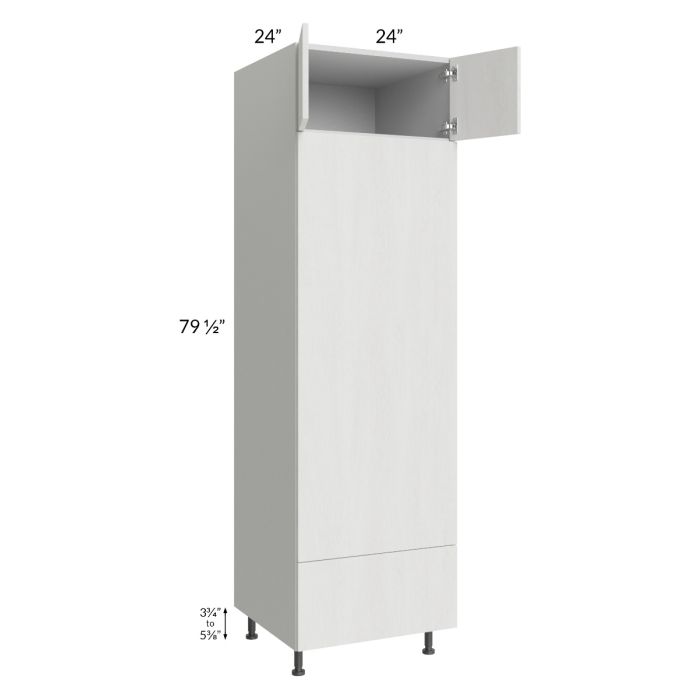 Double oven cabinet with two 11-7/8" high doors on top and one 11-7/16" high drawer on bottom (height is drawer front height). The oven cabinet has a full panel that will need to be cut on site, the maximum cutout is 22"W x 55"H. When using two appliances, it is recommended to provide support for the top appliance; PLY-3/4 can be used and would need to be purchased separately, and then installed on site. Black, adjustable, plastic furniture feet will also be included which will add 3-3/4" to 5-3/8" to the 79-1/2" height.