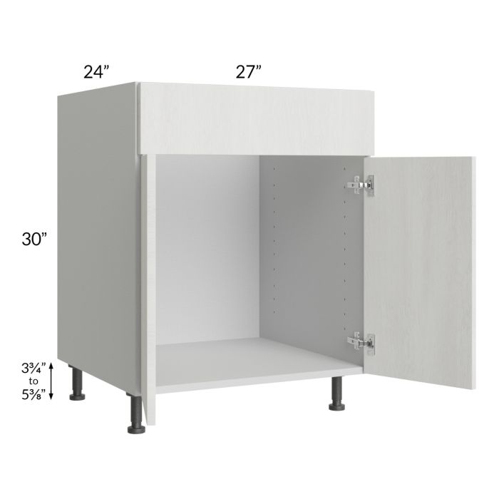 Sink base cabinet with 2 doors and (1) 6-3/4" false drawer front. This cabinet will have no shelves (the sides will come pre-drilled with shelf clip holes if loose shelves are needed - which need to be purchased separately). Black, adjustable, plastic furniture feet will also be included which will add 3-3/4" to 5-3/8" to the 30" height.