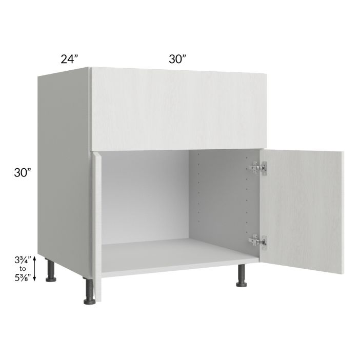 Farm sink base cabinet. Door heights are 17-7/8". Typically, the farm sink base should be a minimum of 3" wider than the farm sink (for example, a 30" farm sink would need a 33" farm sink base). The front panel is attached with clips for easy removal and install. Once removed, the opening will need to be cut, the maximumum it can be cut is 28-1/2"W x 11-5/8"H, then the panel will be reattached back onto the cabinet. To avoid damage to the frame and side panels, please apply extra care when cutting the front panel, blue masking tape is the most commonly used to avoid splintering (strong adhesives must be avoided to avoid pulling the finish off). Black, adjustable, plastic furniture feet will also be included which will add 3-3/4" to 5-3/8" to the 30" height.