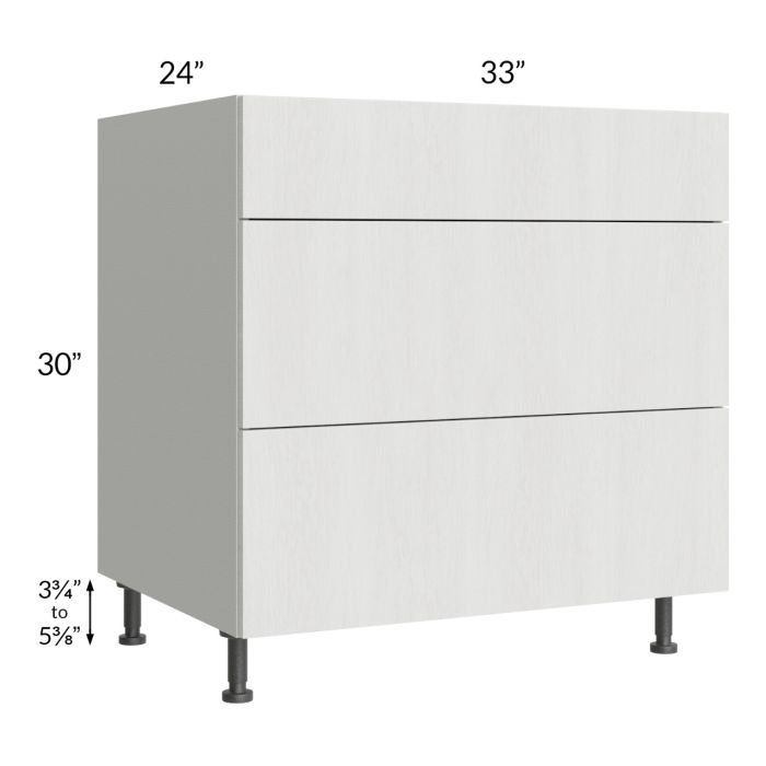 3 drawer base cabinet. Top drawer front is 6-3/4" high, middle and bottom drawer fronts are 11-7/16" separately. Black, adjustable, plastic furniture feet will also be included which will add 3-3/4" to 5-3/8" to the 30" height.