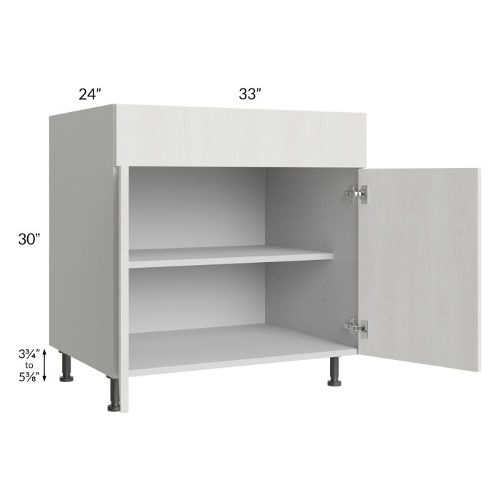 2 door base cabinet with (1) 18" deep adjustable shelves and 1 drawer. Black, adjustable, plastic furniture feet will also be included which will add 3-3/4" to 5-3/8" to the 30" height.