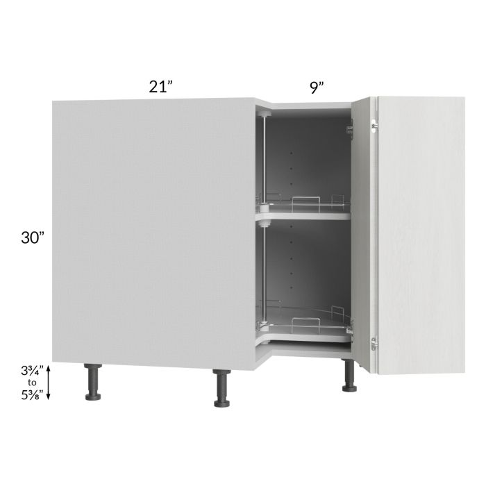 Lazy susan base cabinet that will take up 33" from the corner out, on each wall. Both wooden Lazy Susan trays rotate independently and the center tray is mounted on a 3/4" adjustable shelf. This cabinet cannot use a soft close hinge. Each bi-fold door is 9" wide. It is designed to have a smaller footprint for ease of installation (which is why the depth is 21"). Black, adjustable, plastic furniture feet will also be included which will add 3-3/4" to 5-3/8" to the 30" height.