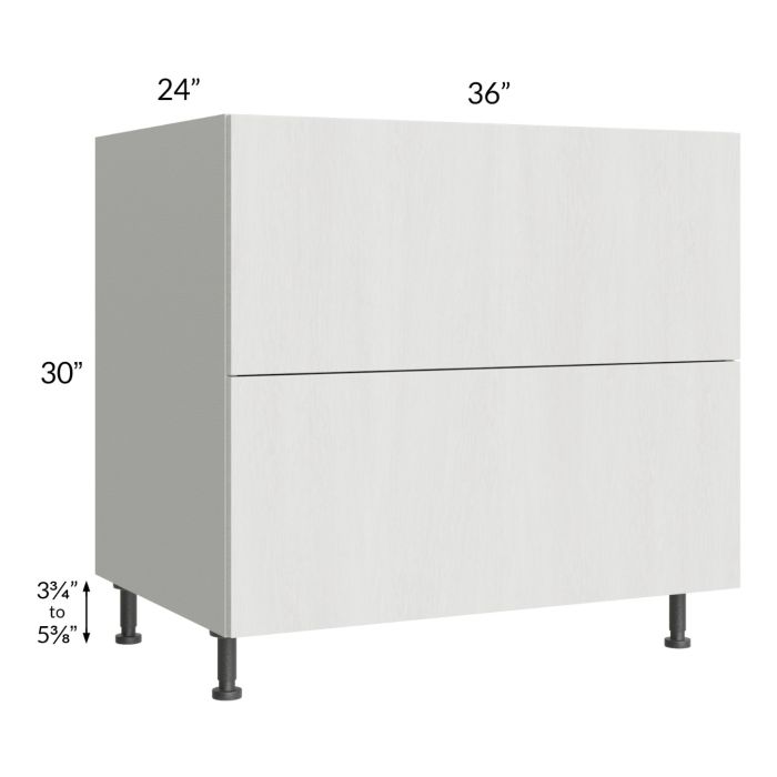 2 drawer base cabinet. Each drawer front measures 14-7/8" high. Black, adjustable, plastic furniture feet will also be included which will add 3-3/4" to 5-3/8" to the 30" height.