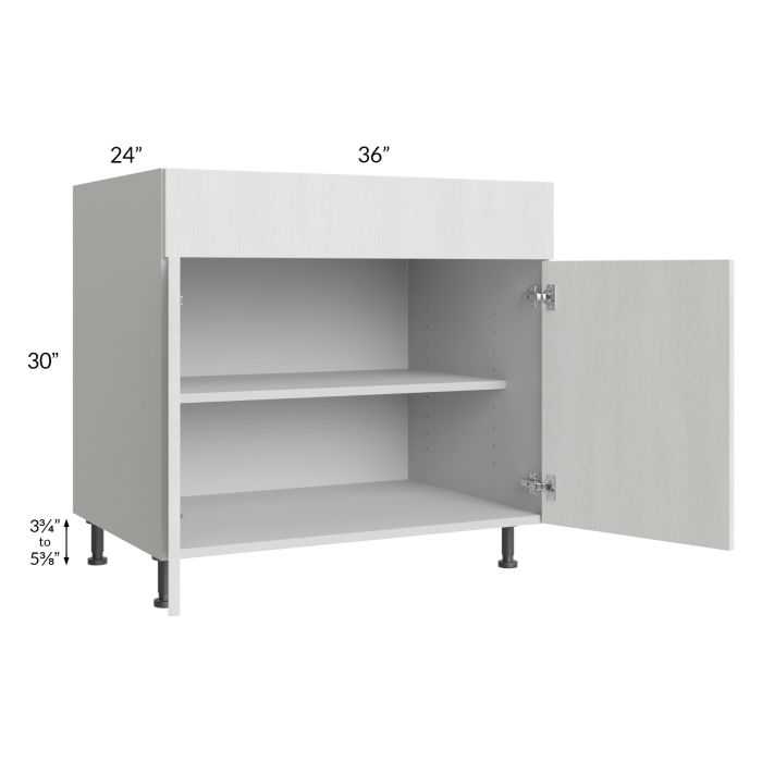 2 door base cabinet with (1) 18" deep adjustable shelves and 1 drawer. Black, adjustable, plastic furniture feet will also be included which will add 3-3/4" to 5-3/8" to the 30" height.