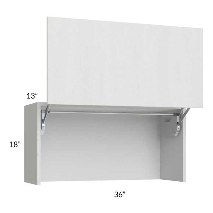 Wall appliance cabinet that is meant to sit on the countertop to hide appliances, it will have an open floor and no bottom rail. It features Blum Lift-Up & Away Hinges to allow the door to lift up and away from the face frame of the cabinet. It will be shipped with a support bracket to be removed before cabinet installation.