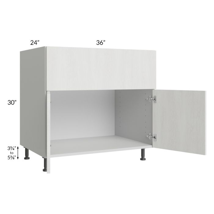 Farm sink base cabinet. Door heights are 17-7/8" and the height above the doors to the top of the cabinet is 11-7/8". Typically, the farm sink base should be a minimum of 3" wider than the farm sink (for example, a 30" farm sink would need a 33" farm sink base).The front panel is attached with clips for easy removal and install. Once removed, the opening will need to be cut, the maximumum it can be cut is 34-1/2"W x 11-5/8"H, then the panel will be reattached back onto the cabinet. To avoid damage to the frame and side panels, please apply extra care when cutting the front panel, blue masking tape is the most commonly used to avoid splintering (strong adhesives must be avoided to avoid pulling the finish off). Black, adjustable, plastic furniture feet will also be included which will add 3-3/4" to 5-3/8" to the 30" height.