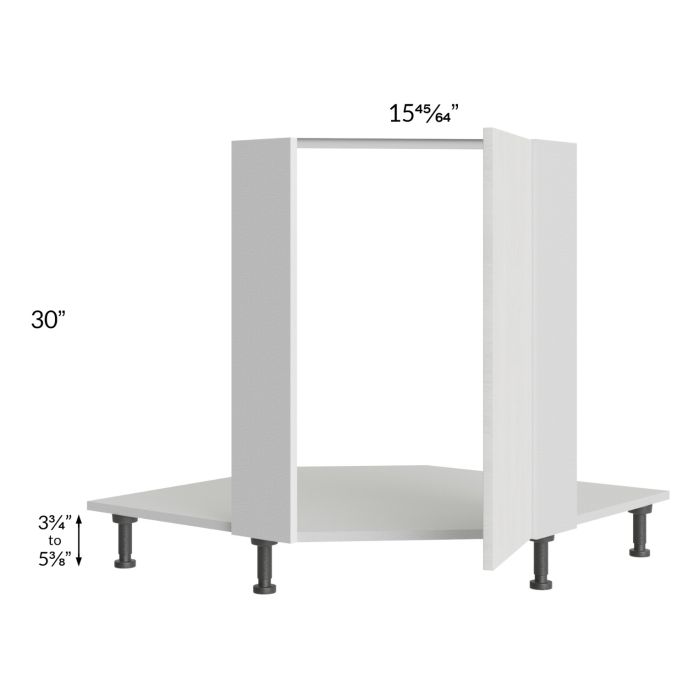 Full height door diagonal corner sink front that will take up 36" of wall space from the corner out, on each wall, once installed. The door width is 15-45/64" and it uses 45-degree hinges with Blumotion soft close. It will include the sink front floor as well as four black, adjustable, plastic furniture feet will also be included which will add 3-3/4" to 5-3/8" to the 30" height. No shelves will be included.