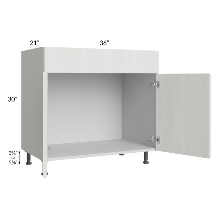 Vanity sink base cabinet with 2 doors and 1 false drawer front. Drawer front is 6-3/4" high. This cabinet will not have any shelves. Black, adjustable, plastic furniture feet will also be included which will add 3-3/4" to 5-3/8" to the 30" height.