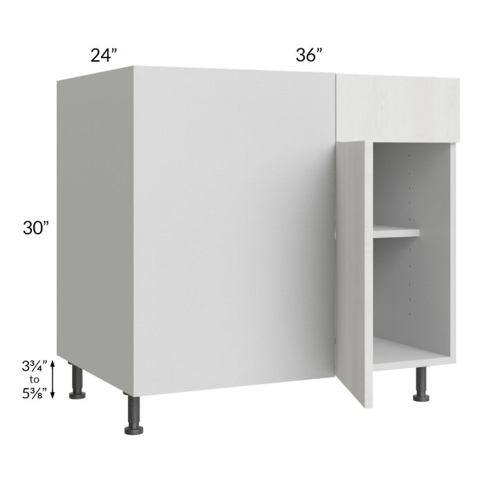 1 door blind base corner cabinet with 1 drawer and (1) 18" deep shelf. The drawer front height is 6-3/4". The actual width is 36", but the cabinet must be pulled at least 6" from the corner, taking up 42" of wall space. It can be pulled a max of 9", taking up 45" of wall space. The door width is 14-7/8" and the blind opening width is 14-11/32". A filler must be used between the blind and the adjacent cabinet so the doors and drawers are able to open without interference. The filler must be purchased separately. Black, adjustable, plastic furniture feet will also be included which will add 3-3/4" to 5-3/8" to the 30" height.