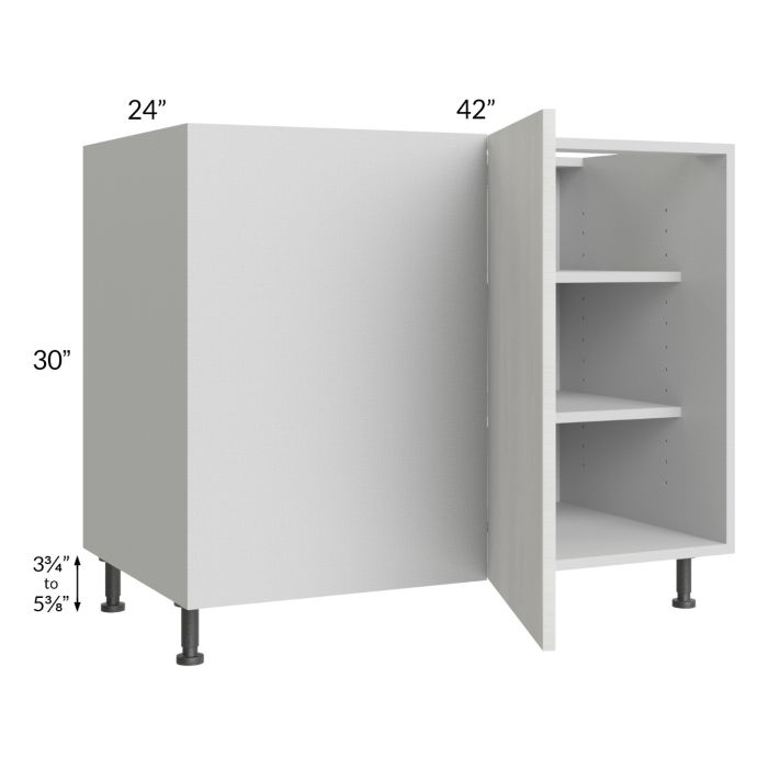 1 full height door blind base corner cabinet with no drawers and (2) 18" deep shelves. The actual width is 42", but the cabinet must be pulled at least 6" from the corner, taking up 48" of wall space. It can be pulled a max of 9", taking up 51" of wall space. The door width is 20-7/8" and the blind opening width is 20-11/32". A filler must be used between the blind and the adjacent cabinet so the doors and drawers are able to open without interference. The filler must be purchased separately. Black, adjustable, plastic furniture feet will also be included which will add 3-3/4" to 5-3/8" to the 30" height.