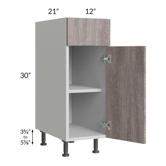 Vanity base cabinet with (1) door, (1) drawer, and (1) 18" deep shelf. The drawer front is 6-3/4" high. Black, adjustable, plastic furniture feet will also be included which will add 3-3/4" to 5-3/8" to the 30" height.