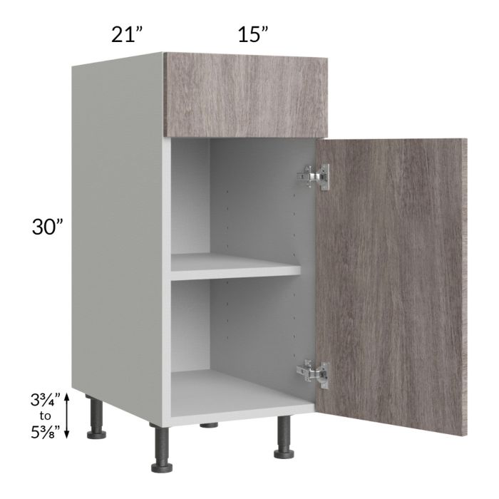 Vanity base cabinet with (1) door, (1) drawer, and (1) 18" deep shelf. The drawer front is 6-3/4" high. Black, adjustable, plastic furniture feet will also be included which will add 3-3/4" to 5-3/8" to the 30" height.