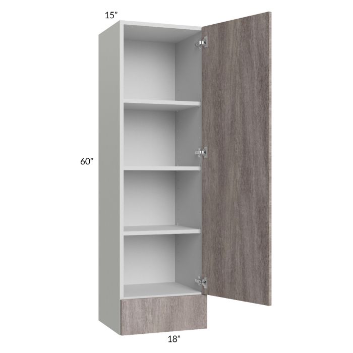 Wall cabinet with (1) 6-3/4" drawer on bottom (drawer front height) and (1) 53" high door on top. There will be 3 adjustable shelves on the top of the cabinet. The exposed sides have near-flush ends and are unfinished, wainscot panels can be ordered to finish exposed sides. **Note this cabinet has a 15" depth**
