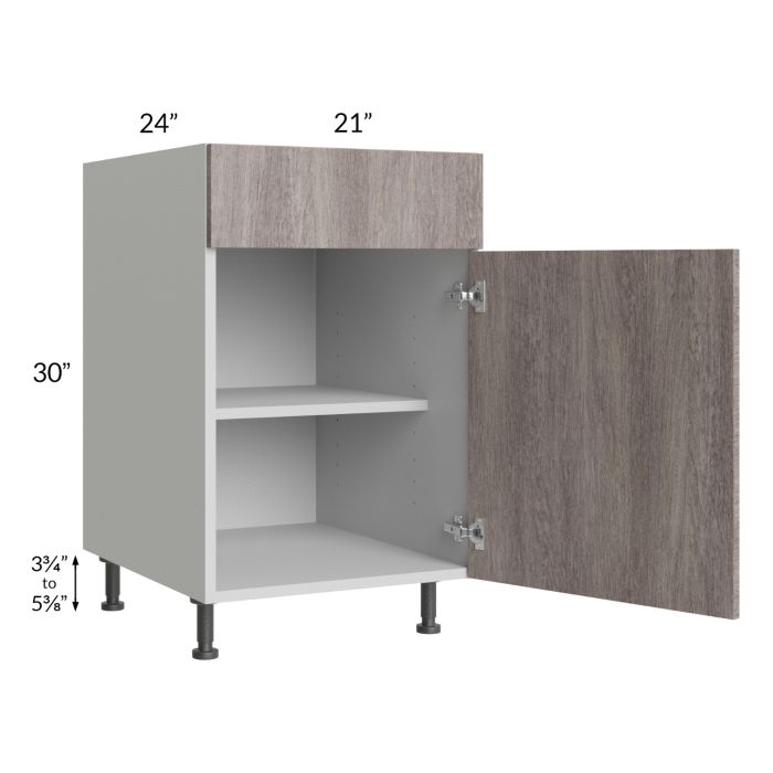 1 door base cabinet with (1) 18" deep adjustable shelves and 1 drawer. Black, adjustable, plastic furniture feet will also be included which will add 3-3/4" to 5-3/8" to the 30" height.