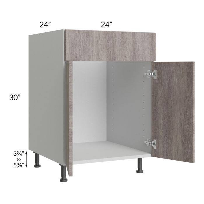 Sink base cabinet with 2 doors and (1) 6-3/4" false drawer front. This cabinet will have no shelves (the sides will come pre-drilled with shelf clip holes if loose shelves are needed - which need to be purchased separately). Black, adjustable, plastic furniture feet will also be included which will add 3-3/4" to 5-3/8" to the 30" height.