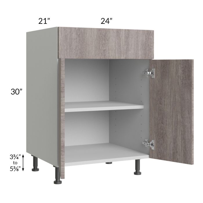Vanity base cabinet with (2) doors, (1) drawer, and (1) 18" deep shelf. The drawer front is 6-3/4" high. Black, adjustable, plastic furniture feet will also be included which will add 3-3/4" to 5-3/8" to the 30" height.