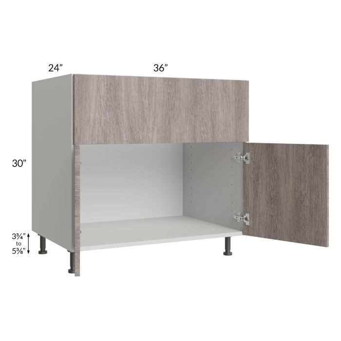 Farm sink base cabinet. Door heights are 17-7/8" and the height above the doors to the top of the cabinet is 11-7/8". Typically, the farm sink base should be a minimum of 3" wider than the farm sink (for example, a 30" farm sink would need a 33" farm sink base).The front panel is attached with clips for easy removal and install. Once removed, the opening will need to be cut, the maximumum it can be cut is 34-1/2"W x 11-5/8"H, then the panel will be reattached back onto the cabinet. To avoid damage to the frame and side panels, please apply extra care when cutting the front panel, blue masking tape is the most commonly used to avoid splintering (strong adhesives must be avoided to avoid pulling the finish off). Black, adjustable, plastic furniture feet will also be included which will add 3-3/4" to 5-3/8" to the 30" height.