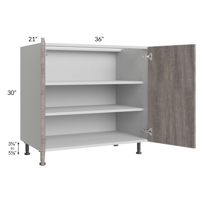 Vanity sink base cabinet with 2 full height doors and 2 shelves. Black, adjustable, plastic furniture feet will also be included which will add 3-3/4" to 5-3/8" to the 30" height.