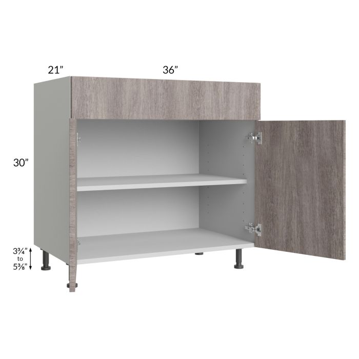 Vanity base cabinet with (2) doors, (1) drawer, and (1) 18" deep shelf. The drawer front is 6-3/4" high. Black, adjustable, plastic furniture feet will also be included which will add 3-3/4" to 5-3/8" to the 30" height.