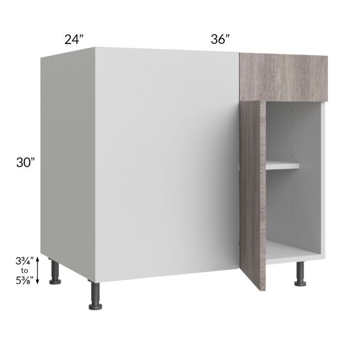 1 door blind base corner cabinet with 1 drawer and (1) 18" deep shelf. The drawer front height is 6-3/4". The actual width is 36", but the cabinet must be pulled at least 6" from the corner, taking up 42" of wall space. It can be pulled a max of 9", taking up 45" of wall space. The door width is 14-7/8" and the blind opening width is 14-11/32". A filler must be used between the blind and the adjacent cabinet so the doors and drawers are able to open without interference. The filler must be purchased separately. Black, adjustable, plastic furniture feet will also be included which will add 3-3/4" to 5-3/8" to the 30" height.