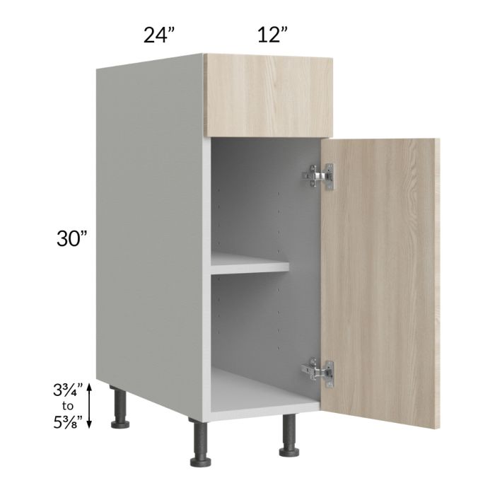 1 door base cabinet with (1) 18" deep adjustable shelves and 1 drawer. Black, adjustable, plastic furniture feet will also be included which will add 3-3/4" to 5-3/8" to the 30" height.