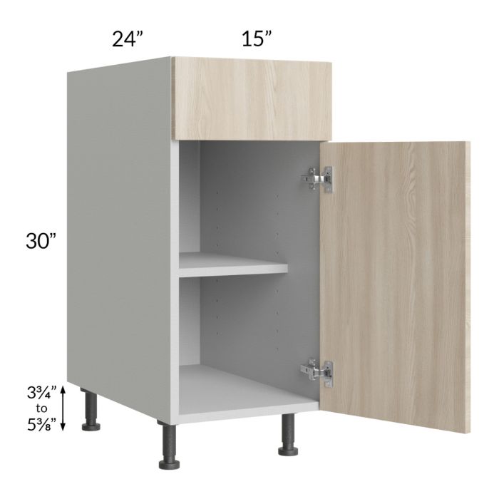 1 door base cabinet with (1) 18" deep adjustable shelves and 1 drawer. Black, adjustable, plastic furniture feet will also be included which will add 3-3/4" to 5-3/8" to the 30" height.