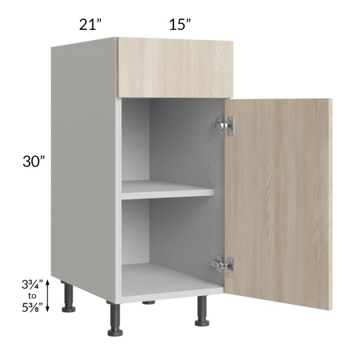 Vanity base cabinet with (1) door, (1) drawer, and (1) 18" deep shelf. The drawer front is 6-3/4" high. Black, adjustable, plastic furniture feet will also be included which will add 3-3/4" to 5-3/8" to the 30" height.