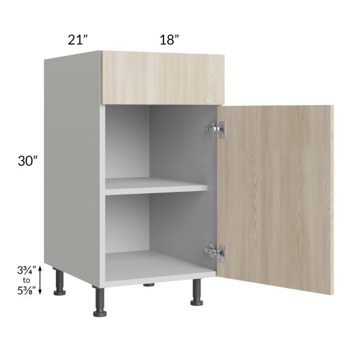 Vanity base cabinet with (1) door, (1) drawer, and (1) 18" deep shelf. The drawer front is 6-3/4" high. Black, adjustable, plastic furniture feet will also be included which will add 3-3/4" to 5-3/8" to the 30" height.
