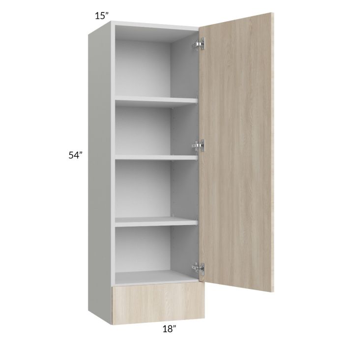 Wall cabinet with (1) 6-3/4" drawer on bottom (drawer front height) and (1) 47" high door on top. There will be 3 adjustable shelves on the top of the cabinet. The exposed sides have near-flush ends and are unfinished, wainscot panels can be ordered to finish exposed sides. **Note this cabinet has a 15" depth**
