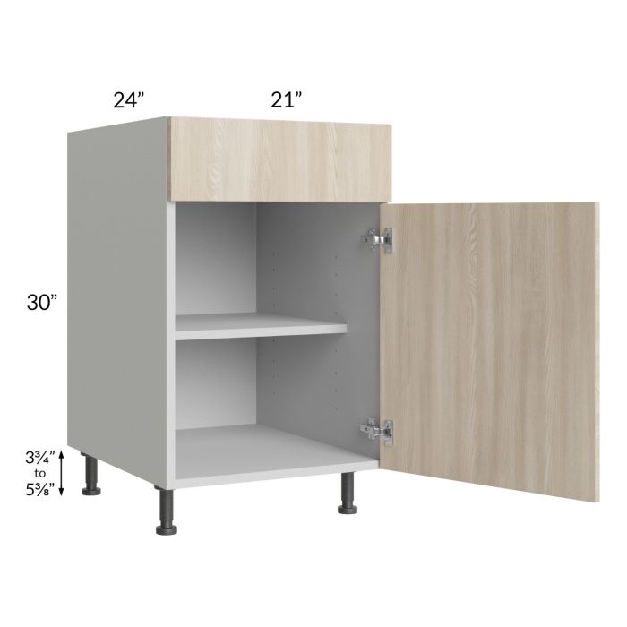 1 door base cabinet with (1) 18" deep adjustable shelves and 1 drawer. Black, adjustable, plastic furniture feet will also be included which will add 3-3/4" to 5-3/8" to the 30" height.