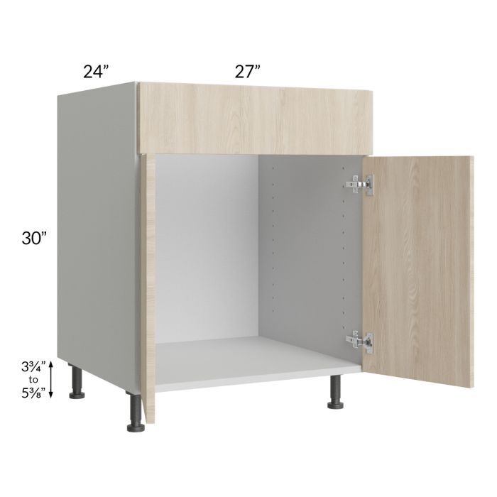 Sink base cabinet with 2 doors and (1) 6-3/4" false drawer front. This cabinet will have no shelves (the sides will come pre-drilled with shelf clip holes if loose shelves are needed - which need to be purchased separately). Black, adjustable, plastic furniture feet will also be included which will add 3-3/4" to 5-3/8" to the 30" height.