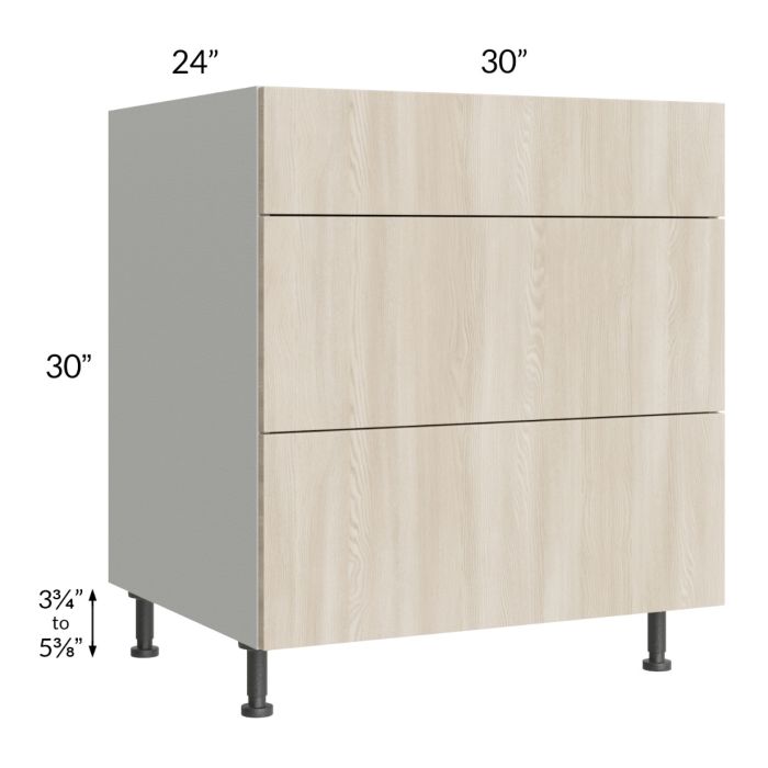 3 drawer base cabinet. Top drawer front is 6-3/4" high, middle and bottom drawer fronts are 11-7/16" separately. Black, adjustable, plastic furniture feet will also be included which will add 3-3/4" to 5-3/8" to the 30" height.