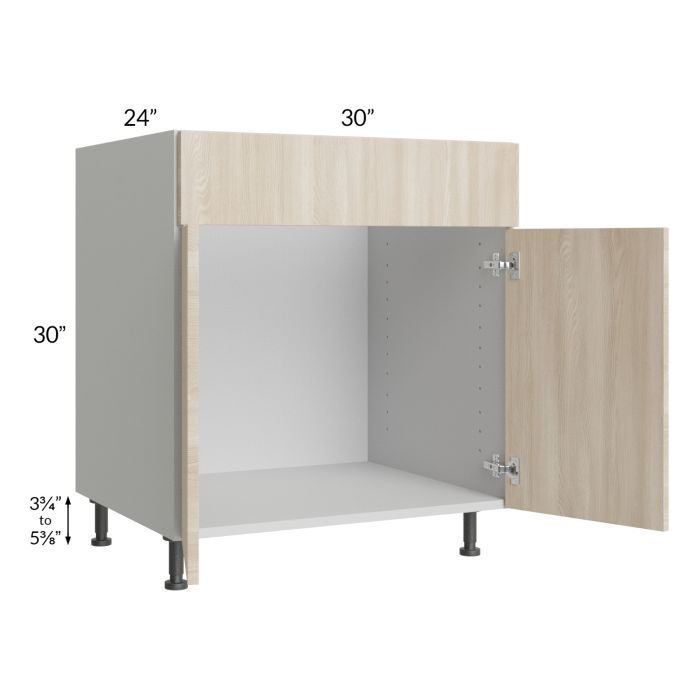 Sink base cabinet with 2 doors and (1) 6-3/4" false drawer front. This cabinet will have no shelves (the sides will come pre-drilled with shelf clip holes if loose shelves are needed - which need to be purchased separately). Black, adjustable, plastic furniture feet will also be included which will add 3-3/4" to 5-3/8" to the 30" height.