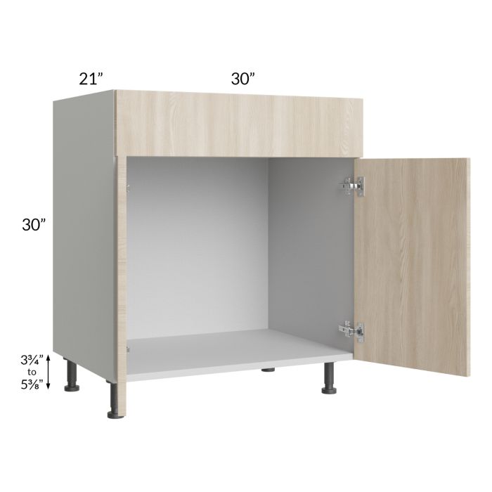 Vanity sink base cabinet with 2 doors and 1 false drawer front. Drawer front is 6-3/4" high. This cabinet will not have any shelves. Black, adjustable, plastic furniture feet will also be included which will add 3-3/4" to 5-3/8" to the 30" height.