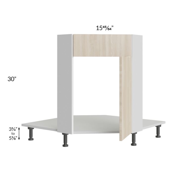 Diagonal corner sink front that will take up 36" of wall space from the corner out, on each wall, once installed. The door width is 15-45/64" and it uses 45-degree hinges with Blumotion soft close. The false drawer front is 6-3/4" high. It will include the sink front floor as well as four black, adjustable, plastic furniture feet will also be included which will add 3-3/4" to 5-3/8" to the 30" height. No shelves will be included.