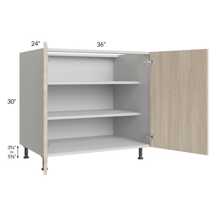 2 full height door base cabinet with (2) 18" deep adjustable shelves. Black, adjustable, plastic furniture feet will also be included which will add 3-3/4" to 5-3/8" to the 30" height. Please note that the shelves will not be included if roll outs are added to the cabinet.