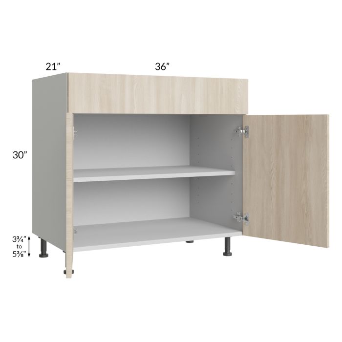 Vanity base cabinet with (2) doors, (1) drawer, and (1) 18" deep shelf. The drawer front is 6-3/4" high. Black, adjustable, plastic furniture feet will also be included which will add 3-3/4" to 5-3/8" to the 30" height.